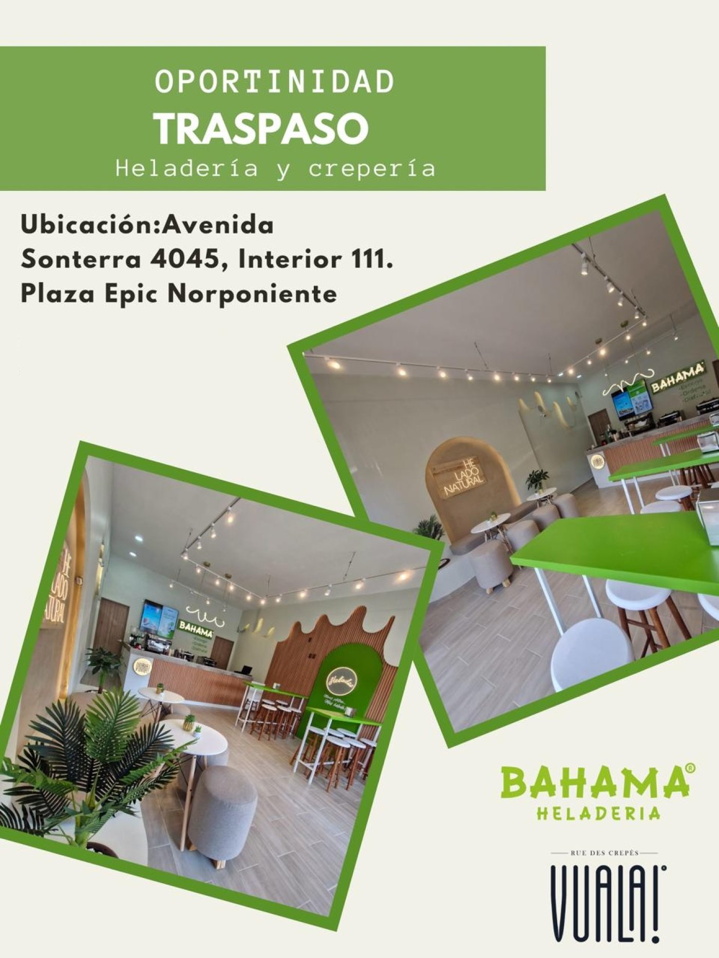 Oportunidad de traspaso de Heladería y crepería (Bahama & Vuala!), equipo nuevo, excelentes utilidades y con 3 colaboradores para operar.